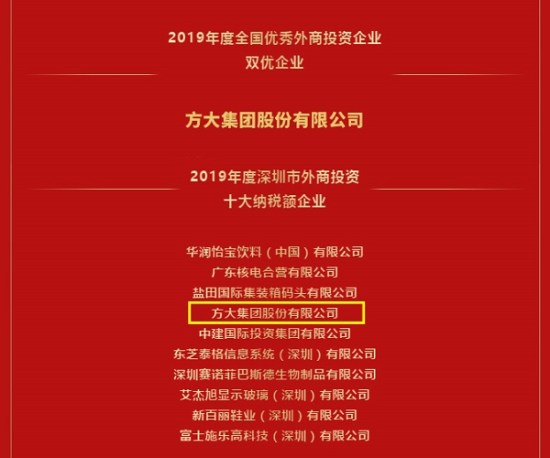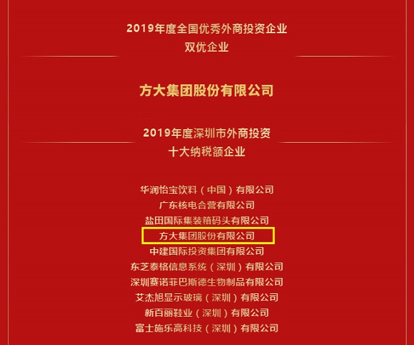 1月8日,全國優秀外商投資企業年度評選深圳榜單揭曉,方大集團榮獲2019年度全國優秀外商投資企業——雙優企業和2019年度全國優秀外商投資企業深圳市十大納稅額企業。