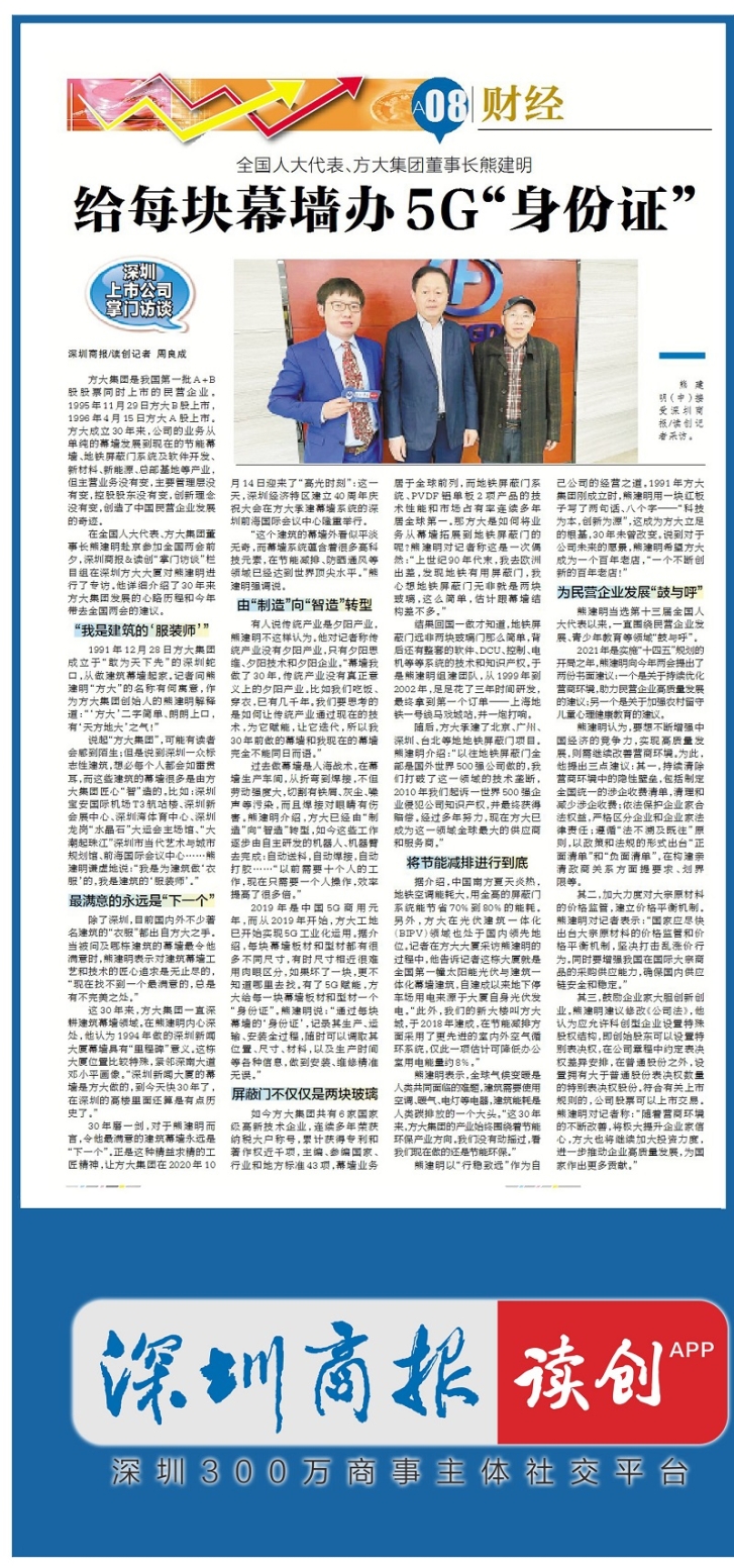 3月8日,深圳商報刊發方大集團董事長熊建明兩會專訪報道《全國人大代表、方大集團董事長熊建明:給每塊幕墻辦5G“身份證”》